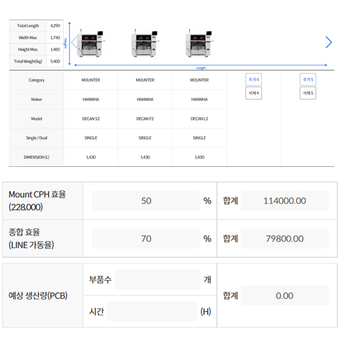 HANWHA MOUNTER 설비의 기본 스펙으로 비교하고, 예상 LINE을 구성해보세요.