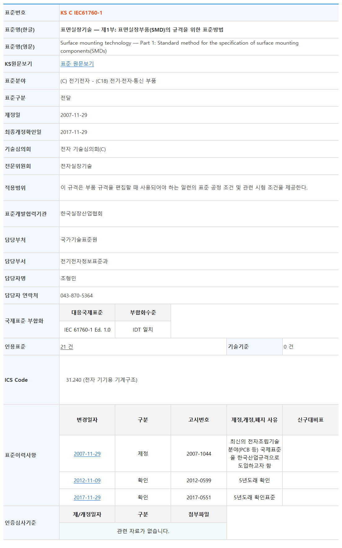 자료링크 >>> 표면실장기술 — 제1부: 표면실장부품(SMD)의 규격을 위한 표준방법